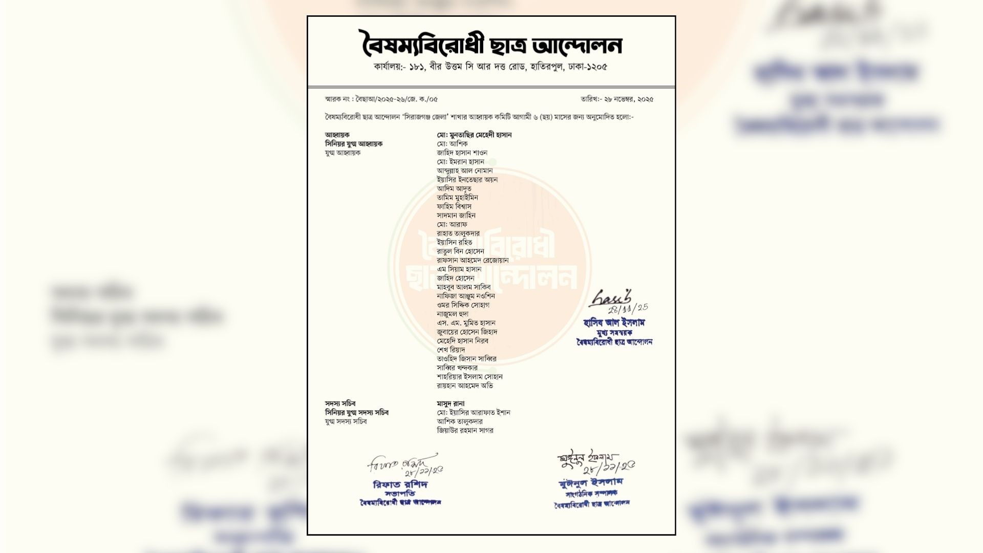 তৃতীয় বারের মতো বৈষম্যবিরোধী ছাত্র আন্দোলনের সিরাজগঞ্জ জেলা শাখার আহ্বায়ক কমিটি ঘোষণা করা হয়েছে। বুধবার (২৮ নভেম্বর ২০২৫) সংগঠনের কেন্দ্রীয় দপ্তর থেকে আগামী ছয় (৬)...