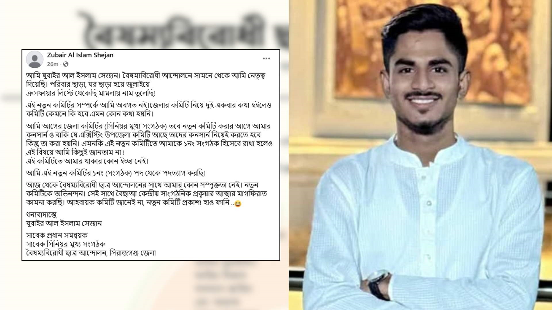 স্ট্যাটাসে সেজান ঘোষণা করেন— “আমি নতুন কমিটির ১ নং সংগঠক পদ থেকে পদত্যাগ করছি। আজ থেকে বৈষম্যবিরোধী ছাত্র আন্দোলনের সঙ্গে আমার কোনো সম্পৃক্ততা নেই। নতুন কমিটিকে অভিনন্দন।”